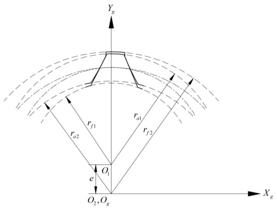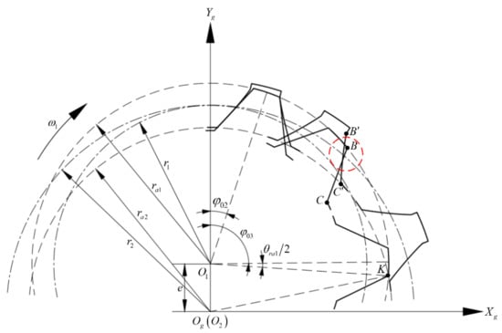 As shown in Figure 3, in the coordinate , the motion trajectories of the addendum and dedendum of the external gear are circles centered on , with radius and , respectively, and the motion trajectories of the addendum and dedendum of the internal gear ring are circles centered on , with radius and , respectively.