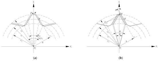 As shown in Figure 5a, the intersection of the linear tooth profile and the reference circle of the external gear is fixed. With the increase of tooth profile angle , the corresponding tooth profiles of the addendum circle and dedendum circle of the external gear decrease. When the tooth profile angle reaches , the dedendum circle will disappear. According to the geometric relationship, the following can be obtained: