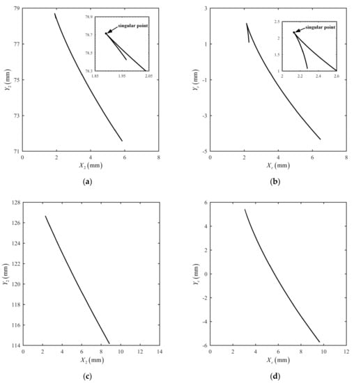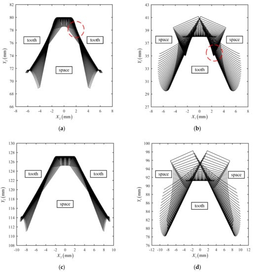 (2) In Figure 16a, as the addendum coefficient gradually increases, the x-coordinate of decreases linearly, and the x-coordinates and of the boundary points remain constant, indicating that the locations of singular points of the conjugate tooth profiles are not affected by the parameter ; parameters , , and change from satisfying to not satisfying the constraints (63) and (65), that is, from no occurrence to the occurrence of undercutting and end cutting. Similarly, in Figure 16b, the parameters , , and remain constant with the increase of dedendum coefficient , indicating that the change of parameter has no effect on undercutting and end cutting, and undercutting will not occur, but end cutting will occur according to the constraints. In Figure 16c, the parameters , , and all increase linearly with the increase of tooth thickness coefficient , and parameters and change from not satisfying to satisfying the constraint (63), that is, from the occurrence to no occurrence of undercutting, while parameters and do not satisfy the constraint (65) all the time; that is, end cutting always occurs. In Figure 16d, the parameters , , and all decrease linearly with the increase of tooth profile angle , and parameters and change from not satisfying to satisfying the constraint (63), that is, from the occurrence to no occurrence of undercutting, while parameters and do not satisfy the constraint (65) all the time; that is, end cutting always occurs.