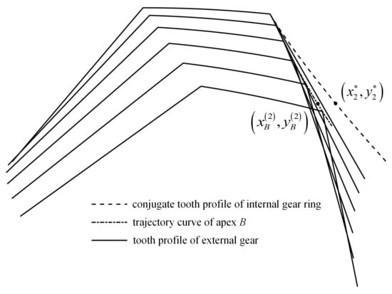 where is the envelope of the curve family formed by the position vector in the coordinate , namely, the position vector of the tooth profile of the internal gear ring. is the normal vector of the tooth profile of the external gear, and is the relative motion velocity at any meshing point on the tooth profiles of the external gear and internal gear ring. Both are defined in the coordinate . From Equation (16), it can be deduced that the tooth profiles of the external gear and internal gear ring need to meet Equation (17) during the meshing process []: