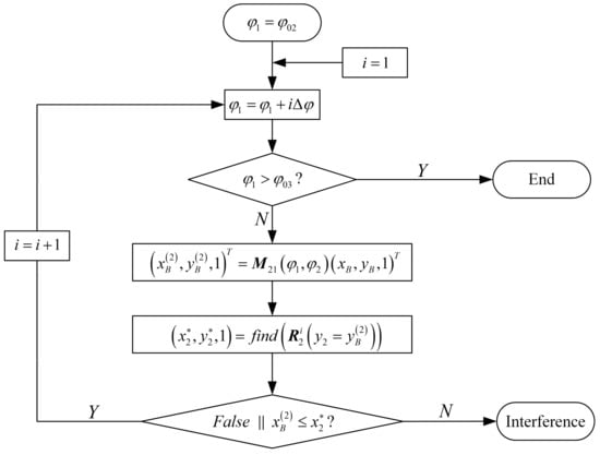 In Figure 13, when , the radial interference of the gear pair will occur at the angle ; on the contrary, when , the radial interference of the gear pair will not occur. Thus, the constraint that there is no radial interference of the conjugated straight-line internal gear pair can be written in the following form: