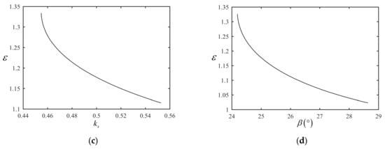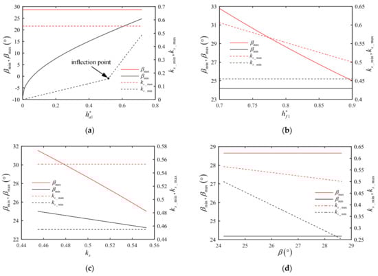 (2) The maximum tooth thickness coefficient is negatively correlated with the parameters and , but independent of the parameters and ; the minimum tooth thickness coefficient is negatively correlated with the parameter , but independent of the parameters and , and positively correlated with the parameter and there is an obvious “inflection point” in its variation curve, which has been marked out in Figure 14a. Combined with the content in Section 3.1.3, at the first stage of the “inflection point,” the minimum value ks_min is determined by Equation (40), and at the later stage of the ”inflection point,” the minimum value is determined by Equation (42).