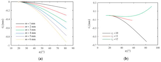 (1) In Figure 17a, when the module increases from 1 mm to 6 mm, the value range of angle does not change, indicating that the module has no influence on the checking range of interference. Meanwhile, the relation is always valid in the checking range of angle , satisfying the constraint (72), indicating that no tooth-overlapping interference occurs. Since the size of the gear pair is proportional to the module, combined with the calculation results, it can be obtained that the transverse distance between the apex and the conjugate tooth profile is the same as the increase proportion of the module at the same angle , indicating that the change of module will affect the value of the function , but will not affect the check result of the tooth-overlapping interference; that is, the interference cannot be avoided by adjusting the module.