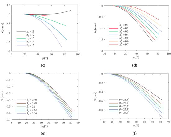(3) As can be seen from Figure 17d, when the addendum coefficient increases from 0.1 to 0.7, the relation is valid in the whole checking range of the angle , satisfying the constraint (72), and no tooth-overlapping interference occurs. The larger the addendum coefficient , the smaller the transverse distance between the apex and the conjugate tooth profile will be, and the more likely that the interference will occur. Similarly, it can be seen from Figure 17e,f that no tooth-overlapping interference occurs when the tooth thickness coefficient or the tooth profile angle increases, and the larger the parameters or , the less likely that the interference will occur.