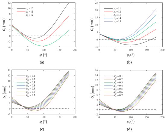 Through the analysis of the derivation process and calculational formulas of the constraint of radial interference, the decision function of radial interference varies with the external gear angle , and the value range of the angle can be set as 0–180° according to the symmetric relationship. In addition, the function is not affected by the design parameters and , but is related to the parameters , , , , , . The influences of the above parameters on the function are shown in Figure 18.