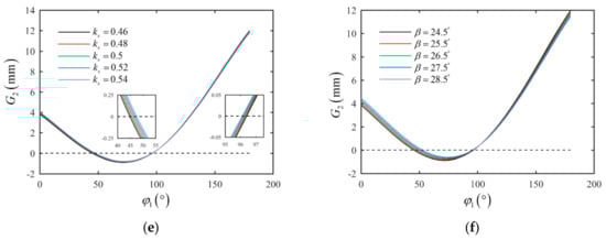 (2) As can be seen from Figure 18c, when the addendum coefficient is less than 0.3, the relation is valid in the whole value range of the angle , satisfying the constraint (79), and no radial interference occurs. With the further increase of the parameter to 0.7, the relation occurs and the corresponding value range of the angle becomes larger, indicating that radial interference occurs, and the larger the parameter , the more likely that radial interference will occur. As shown in Figure 18d, when the addendum coefficient increases from 0.1 to 0.7, the relation exists all the time and the corresponding value range of angle becomes larger, indicating that radial interference occurs, and the larger the parameters , the more likely that radial interference will occur. As shown in Figure 18e,f, the corresponding value range of angle becomes smaller to the relation when the tooth profile angle increases from 24.5° to 28.5° or the tooth thickness coefficient increases from 0.46 to 0.54, indicating that the larger the parameters and , the less likely that radial interference will occur.