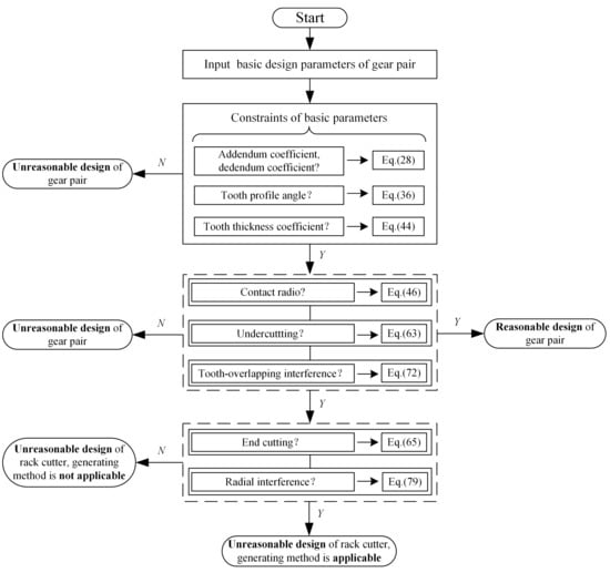 - The calculation formula and the constraint of the contact ratio are deduced according to the kinematic relations. Based on Litvin’s undercutting theory, the constraints on avoiding undercutting and end cutting are deduced and their correctness is verified by examples. The judgment method of tooth-overlapping interference and its corresponding numerical calculation flow are presented. The constraint on avoiding radial interference is deduced and analyzed.