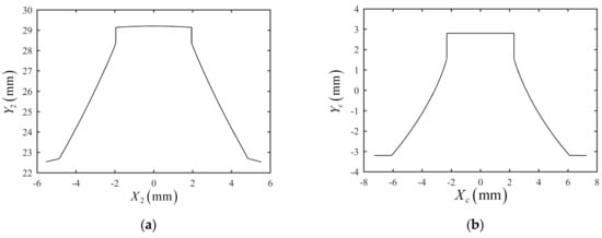 Similarly, the solution of the tooth profile of the rack cutter needs to satisfy both Equations (18) and (19):