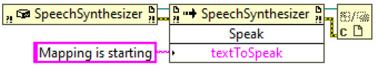 A text-to-speech synthesizer generates speech against corresponding text inputs. It has been used to provide easier means of communication and to increase the access of visually impaired people to textual information [31]. Researchers work on adding more languages to the text-to-speech synthesizers and improving the sound quality. There are several ways to translate the text to speech in LabVIEW [32]. In this study, we used the .NET callback event resource in LabVIEW to receive messages from the Speech Synthesizer assembly to perform updates during speech. The blocks given in Figure 2 are used for the program that converts text to speech.