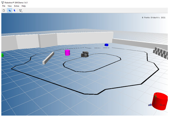 Robotino® SIM is a simulation environment developed to experiment with the Robotino mobile robot. Algorithms written for Robotino can be tested through different sensors and actuators on the robot in the Robotino® SIM environment [33]. An RGB camera, infrared distance sensing sensors, and 3 encoders connected to the wheels on the Robotino can be used in the simulation environment. Different-colored obstacles can be placed at the desired location, and these obstacles can be detected with infrared sensors or an RGB camera. In order to determine the route we want the robot to follow, a line can be drawn in the desired color; the color of the line can be taught to the robot, and the line can be followed. The simulation environment is displayed in 3D on the computer screen as shown in Figure 3.
