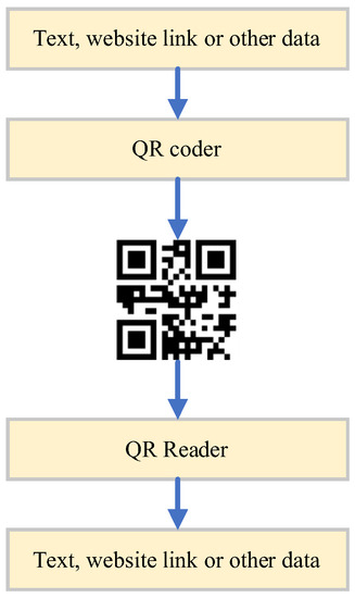 A QR code is a type of matrix barcode or two-dimensional code designed to store data information [34]. QR code means “quick response” in English. It was invented by the Japanese company Denso Wave. Denso Wave, a subsidiary of Toyota, used this technology for inventory tracking in the production of vehicle parts in 1994. Information is encoded in both vertical and horizontal directions, so it can store several hundred times more data than conventionally used barcodes. Data are accessed by taking an image of the code via a camera and processing the image with a QR reader [35]. In Figure 4, the stages of generating, reading, and evaluating a QR code are explained. A web page or computer executable application can be used to generate the desired QR code. In this study, the image obtained by reading the generated QR code with the camera was processed, and its meaning was determined by transferring it to the application where the code was created.