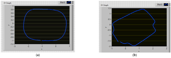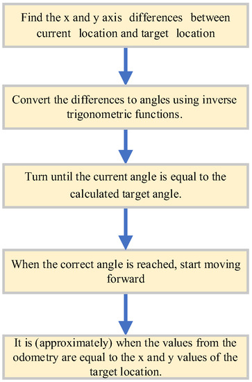 The instantaneous angle of the mobile robot is determined through the data obtained from the odometer. The mobile robot turns until the difference between its own angle and the target angle reaches approximately zero. When the angle is determined, the robot is now headed towards the target point from its current position. By making the robot move at a constant speed at this angle, it is ensured that it moves towards the target point. When the x and y values read from the odometry data of the mobile robot approaching the target point approximate the x and y values of the target point, the mobile robot reaches the target point and stops, as shown in Figure 5.