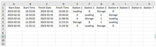 In this study, we decided to conduct the tasks of the mobile robot with the work order method. With the work order, the mobile robot is provided to carry materials between the working areas that it has learned through mapping. A starting point and destination point are determined in the work order. In addition, the materials to be transported between the starting point and the destination point are defined. These materials to be transported are defined separately so that the mobile robot can understand whether it has received the material it is carrying through QR codes in which the materials are defined. The work order is transmitted to the mobile robot via an Excel spreadsheet. A screenshot of the Excel table where the work order is to be executed is given in Figure 6. The Excel file is backed up in the robot’s memory or on the computer where the robot is controlled. Each work order line can be increased to 16 stations; unnamed stations are not in use. Each line contains the date and time information on which the work order was given and completed.