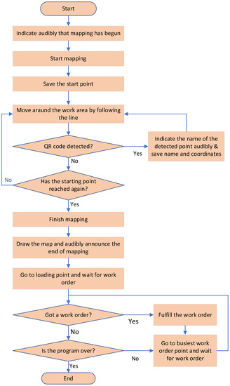 To use the mobile robots for material transport between production stations in smart factories, first, a black line was drawn between the production stations, a QR code was attached to each station, and the station was named. When the mobile robot is placed at the determined starting point, it firstly follows the black line with the RGB camera on the robot, reads the QR codes on all production stations, and saves the coordinates of these stations with their names. When it reaches the starting point after all QR codes are read, the mapping and placement process is complete. The robot tells the user audibly when it has started the mapping process. It notifies the user audibly when the mapping or placement process is completed at each production station it determines. Since the mapping and placement process is made by a supervisor to teach the robot about the working environment, it does not include obstacle avoidance procedures, as there is no possibility of an obstacle or unknown object in the working environment.