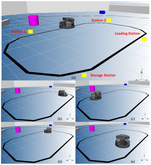 (a) Locations determined in the simulation. (b) The mobile robot is located at the loading station. (c) The mobile robot is located at station 1. (d) The mobile robot is located at station 2. (e) The mobile robot is located at the storage station.