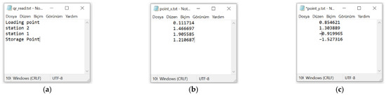 After the mapping was completed, the mobile robot was able to fulfill the work orders. It successfully read the QR codes used to introduce the materials to be transported and was able to detect the materials given to and taken from the robot. After mapping, the robot saved the names of the production stations, the coordinates on the x-axis, and the coordinates on the y-axis as separate files. These files are shown in Figure 12a, b, and c, respectively, and can be accessed whenever needed.