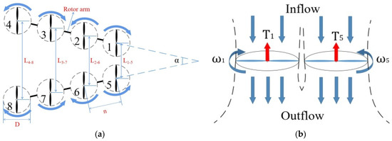 Sketch of V8 Octorotor MAV. (a) Geometry and forces which each rotor is labelled from 1 to 8, and arrows are the rotation direction which means adjacent rotors are clockwise and counterclockwise.; (b) Flow field with aerodynamic interference for rotors 1 and 5, for instance.