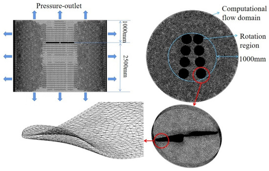The Reynolds number is approximately 0.59 × 105~0.99 × 105, and density of air and viscosity of air are set as 1.225 kg/m3 and 1.7894 × 10−5 kg/(m·s) respectively. The rotor model is displayed in Figure 4.