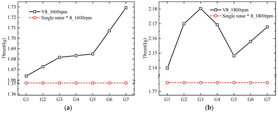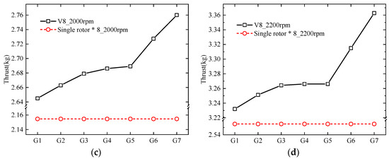 The rotational speeds of 1600 rpm, 1800 rpm, 2000 rpm and 2200 rpm are selected as four specific rotational speed cases in hover. ‘G’ is short for Group in the following figures. The variation of thrust with increased rotor spacing at 1600 rpm, 1800 rpm, 2000 rpm and 2200 rpm are shown in Figure 6. Eight single rotors without interference are also introduced as comparison to obtain the effect of the interference. As shown in the figure, the maximum thrust of the V8 Octorotor MAV is 3362.801 g which increased 4.05% compared with isolated rotors without interference. There is a sudden change at G3 and G5, and there is also a moderate thrust increment from G1 to G3, and huge increment from G5 to G7. Thus, it is very interesting to note the thrust increment, which indicated an improved aerodynamic performance with a higher manipulation.