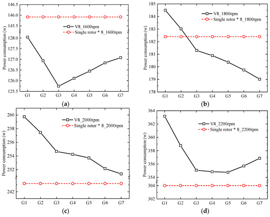 The variation of power consumption with increased rotor spacing at 1600 rpm, 1800 rpm, 2000 rpm and 2200 rpm are shown in Figure 7. Power consumption of V8 Octorotor MAV is lower than that of the isolated rotors at 1600 rpm and 1800 rpm, which indicates that this kind of MAV achieved a higher flight duration, especially for a lower rotor speed. The hovering power consumption for G1 and G2 is higher than that of eight single rotors which may be caused the strong interference for a smaller rotor spacing. Additionally, there is clear sudden change at G3 where the lowest power consumption is about 125.743 w. Thereafter, the power increased with the rotor speed. This may be caused by the increasing rotor interference between the adjacent rotors on the same rotor arm with the fixed rotor spacing while the rotor interference is intended to decrease from G5 to G7 with the increasing rotor spacing.
