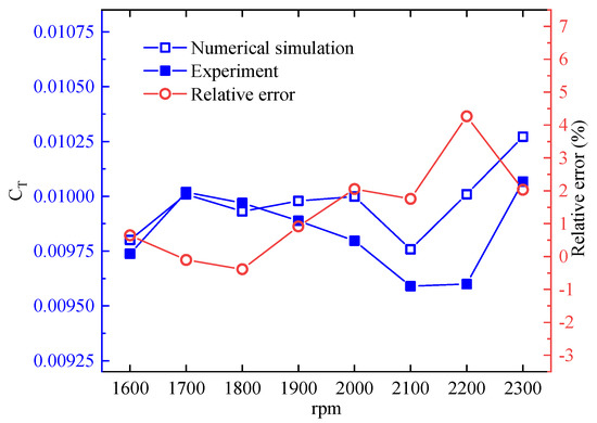 Validation of the simulations with experimental results is showed in Figure 9. The thrust coefficient CT exported from the simulations and calculated with the experimental data is promoted as the comparison. Results showed that the relative error between the experiments and simulations is less than 5% and they were generally in good agreement.