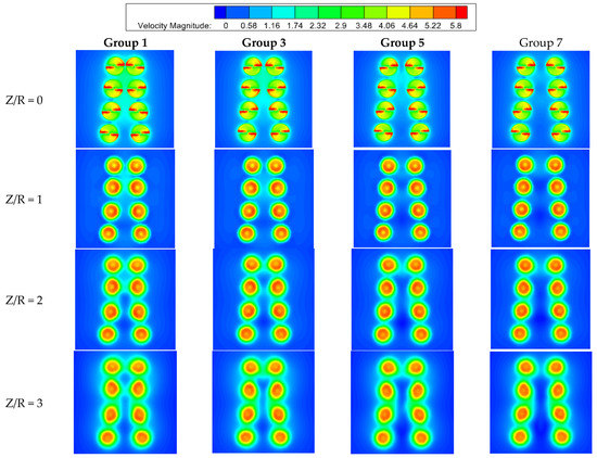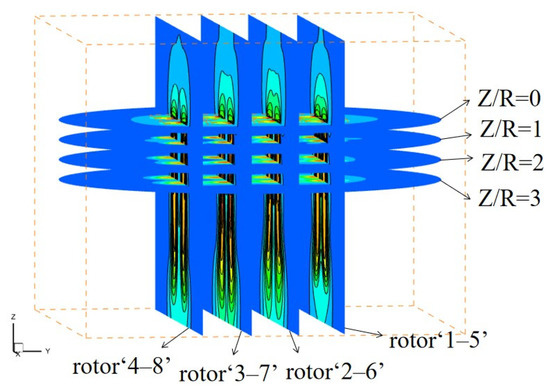 Figure 12 shows the velocity distribution of the V8 Octorotor MAV in cross profiles at 0R, 1R, 2R and 3R from the XY plane for Group 1, Group 3, Group 5 and Group 7. The inflow is coupled easily between adjacent rotors with small rotor spacing, especially between four rotors on the same rotor arm. At plane of Z/R = 0 for Group 1, the velocity of the concentrated airflow is higher than the external airflow velocity, especially for the rotor ‘1–5’ and ‘2–6’. In this case, the mutual induction of downwash tends to attract each other, which will lead to thrust increment. However, this increment is weakened between the rotor ‘4–8’ for the increase of rotor spacing, especially at Group 7. The airflow velocity decreases where the improved performance may come from the further decreased power consumption, and the interference of the downwash is also weakened.