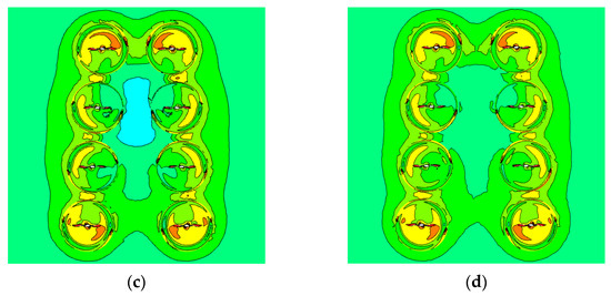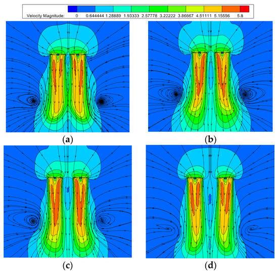 Velocity distribution. (a) rotor ‘1–5’; (b) rotor ‘2–6’; (c) rotor ‘3–7’; (d) rotor ‘4–8’.