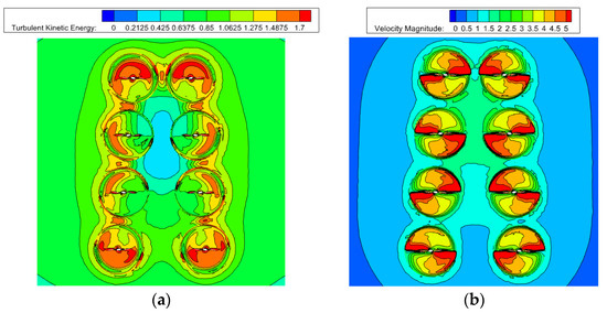 Figure 13 shows turbulent kinetic energy and velocity distribution of the V8 Octorotor MAV at Group 3 (1.2D–1.4D–1.6D–1.8D) where both the thrust and the power consumption presented a sudden change for this case. As showed in the figure, the higher turbulent kinetic energy is mainly distributed on the blade tip for each rotor of the V8 Octorotor MAV, which indicates that this part maintains a higher velocity pulsation of airflow. Obviously, there is turbulence coupling between adjacent rotors on the same rotor arms with a fixed rotor spacing, and the turbulence kinetic energy generated by turbulence coupling at this part of the position is relatively higher. On the contrary, the turbulent kinetic energy of the airflow of the adjacent rotors on the two rotor arms with the increasing rotor speed caused the turbulent kinetic energy is lower at the centre of the V8 Octorotor MAV system, which indicates that the pulsation degree of the airflow velocity is also low. For velocity distribution, the high-speed area is mainly distributed near the surface of each rotor. On the contrary, the airflow velocity at gaps between adjacent rotors is relatively lower.