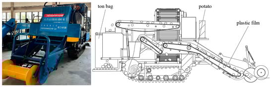 During operation, the profiling crushing roller of the digging and lifting device crushes the soil clods on the surface of the film and limits the digging depth of the machine, while the earth-cutting disc cuts the soil clods, vines, and weeds to prevent congestion and entanglement at the front end of the digging and lifting device. The digging shovel picks up the plastic film and potato mixture and transports it to the potato–plastic-film separation device via the lifting chain. The potato and soil are initially separated, and some soil pieces and debris are sieved off through the gaps in the lifting-chain bars through shaking and loosening. The potato–plastic-film separation device separates the plastic film from the potato tubers and further crushes and sieves off the large soil pieces. The plastic film is transported to the collecting device for rolling and bundling, while the potato and soil pieces that cannot pass through the gaps of the conveying chain rod fall into the circulating and lifting device. This further separates the potatoes from the soil pieces and lifts them to the manual sorting platform, where the unscreened soil pieces are screened out by hand by two to four operators. The conveyor screen transports the potatoes backward to the ton bag for collection, and the ton-bag handling device unloads the bag full of potatoes to the ground.