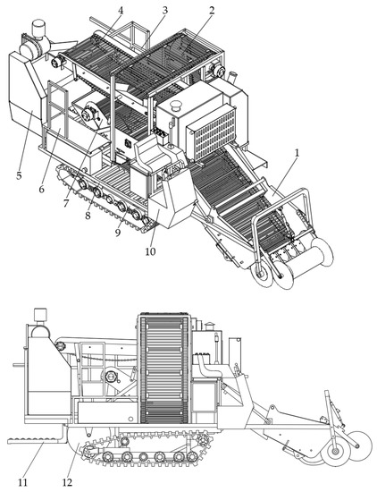 Perspective view and side view of the self-propelled machine for combined potato harvesting and residual plastic film retrieval: 1—digging and lifting device; 2—circulating and lifting device; 3—platform I; 4—manual sorting platform; 5—engine assembly; 6—platform II; 7—potato–plastic-film separation device; 8—frame; 9—crawler chassis; 10—cab; 11—ton-bag handling device; 12—residual-film collecting and bundling device.