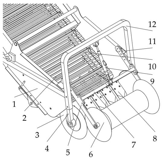 CAD model of the digging and lifting device of the self-propelled machine for combined potato harvesting and residual plastic film retrieval: 1—side plate of the digging device; 2—lifting chain; 3—earth-cutting disc; 4—disc support; 5—connecting plate; 6—profiling crushing roller; 7—connecting crossbar; 8—digging shovel; 9—limiting pull rod; 10—scraper; 11—ear plate; 12—U-shaped connecting rod.