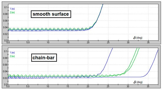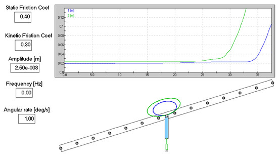 To reduce the overall length of the machine and improve its passing ability, the tilting angle (δ) of the digging and lifting device was designed to be adjustable up to 35°. Figure 4 and Figure 5 show a Working Model 2D [40] simulation of potatoes sliding along a smooth ramp and a lifting chain bar (either vibrating or not) for comparison, the angle (δ) of which is progressively increased from zero to more than 35°. The mass of the average-size potato was set to 80 g, and the mass of a large potato was set to 120 g. The static coefficient of friction between the potatoes and the lifting chain/smooth ramp was 0.4, and the kinetic coefficient of friction was 0.3 [41,42,43,44].