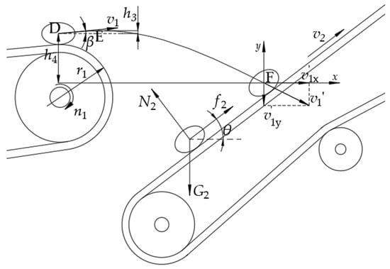 Figure 12 shows a schematic diagram of the receiving section of the circulating and lifting device. The motion of potatoes falling from the lower end of the conveying chain of the potato–plastic-film separation device to the lifting screen of the circulating and lifting device is an oblique downward motion with an initial velocity (v3).