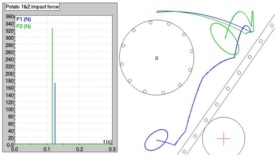 The force with which the potato impacts the second conveying chain rod depends on the mass of the potato, the coefficient of restitution, and whether the potato impacts one rod centrically (i.e., the center of mass of the potato is aligned with the centroid of the conveyor rod) or offset. Because time t1 in Equation (17) decreases, for larger angles (θ), the impact velocity is decreased, as well as the impact force between the potato and the conveyor rods. Figure 8 is a Working Model 2D [40] simulation the impact between two potatoes of average and large size and the conveyor of the potato–plastic-film separation device, confirming this assumption. The masses of the two potatoes were 80 and 120 g, respectively; the static coefficient of friction was 0.44; the kinetic coefficient of friction was 0.269; and the coefficient of restitution was 0.525 [41,42,43,44].