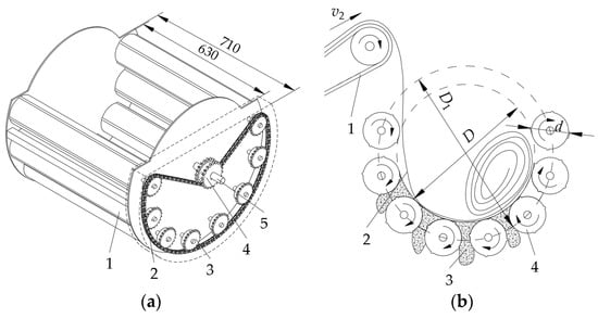 Figure 9b shows the operation principle of the residual-film collecting and bundling device, where v2 is the linear speed of the conveying chain of the potato–plastic-film separation device, D1 is the diameter of the circle formed by the plastic film rolling rollers, D is the maximum diameter of the residual plastic film bundle, and d is the outer diameter of one plastic film rolling roller.