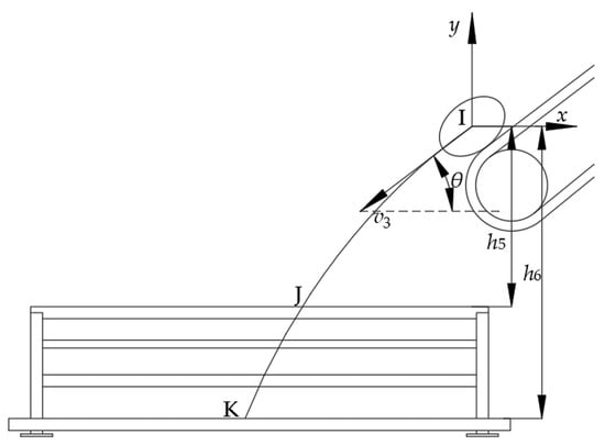 In Figure 12, point I is the position of the center of mass of the potato when at the lower end of the potato–plastic-film separation device. Point J is the intersection of the potato’s trajectory and the upper end of the lifting scraper after the potato is thrown, and point K is the impact point between the potato and the lifting-screen rod of the circulating and lifting device. For a fixed reference frame with its origin at point I (Figure 12), the equations of motion of the center of mass of the potato are: