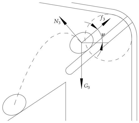 When the lifting scraper moves to the upper end of the circulating and lifting device, potatoes are thrown to the potato slide plate to slide into the manual sorting platform. This unloading process corresponds the force diagram presented in Figure 13, where G3 is the weight of the potatoes carried by the lifting scraper, N3 is the supporting force of the lifting scraper on the potato, f3 is the friction between the potato and the lifting scraper, and ψ is the included angle between the lifting scraper and the horizontal plane at the tangential point of the guide support wheel at the upper end of the circulating and lifting device.