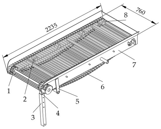 The circulating and lifting device is divided into the receiving section, lifting section, and unloading section [49]. In the receiving section, potatoes fall from the front of the potato–plastic-film separation device at a certain speed onto the lifting screen of the circulating and lifting device. In this section, the potatoes must accurately fall into the gap of the lifting scraper that is installed in the lifting screen without being damaged, while at the same time, debris is sieved. In the lifting section, potatoes must be transported smoothly, while in the unloading section, potatoes must slide smoothly onto the conveyor chain of the manual sorting platform.