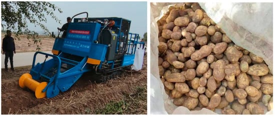 Gansu Province is one of the major potato producers in China, with 6.87 million hectares cultivated in 2020, of which 70% were small plots of gently sloping land of less than 10 degrees or horizontal terraces [6,7]. Due to their large size and ample turning radii, commercially available potato harvesters cannot operate on small plots [8,9,10]. Consequently, farmers working on small plots of land use suspended or tractor-type potato diggers to spread the tubers on the ground, then manually pick the potatoes [11,12,13,14,15,16]. Manual picking is both time-consuming and labor-intensive and has become a limiting factor in expanding potato production in Gansu Province.