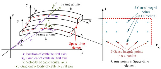 Equations (11)–(13) and (17) involve numerical integration, particularly Gauss integration in the spatial domain. The action given in Equation (10) is also evaluated using Gauss integration in the time domain. The number of Gauss integration points depends on the shape function and the calculation of kinetic energy, potential energy, and work. This process is similar to selecting Gauss integration nodes in a static planar problem. However, unlike in planar static problems, the selection of spatiotemporal Gauss integration nodes replaces the y-axis with the time axis, as shown in Figure 1.