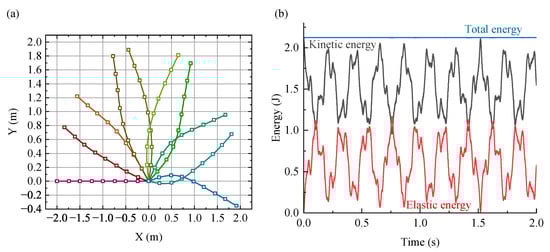 In example-2, the response to asymmetric velocity is illustrated in Figure 5. The motion is centrally symmetric, with the bending and rotation of the cable being the primary movements due to elasticity over 1.8 s. The conservation of the middle point position of the cable and total energy is shown in Figure 5a. Without any restrictions, the middle point of the cable remains at the original position. The variation of potential energy, kinetic energy, and the summary of potential and kinetic energy over time are presented in Figure 5b. The kinetic and potential energy exhibit periodicity, but their summary remains nearly constant over time. These two results illustrate the conservation of the space-time ANCF method.