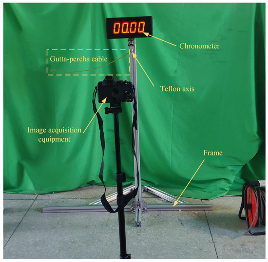 The experimental setup is depicted in Figure 9, consisting of a frame structure, axis, shaft, flexible cable, and image acquisition equipment. The axis is made of Teflon due to its low density and self-lubrication properties. A green screen is positioned behind the frame structure to facilitate image processing. The Olympus Stylus 1 s camera and its components are used for image acquisition. The cross-section size is measured using a sliding gauge, and the cable’s mass is determined using the YP202A electronic balance. The cable’s density and Young’s modulus are then calculated with successive minus method.