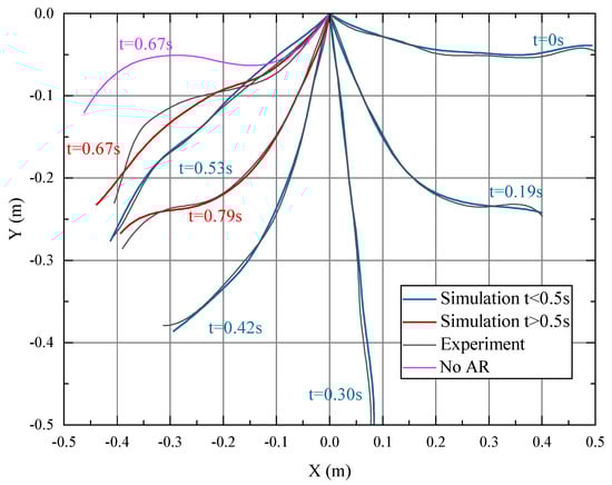 The gray line in Figure 10 represents the experimental curve, while the blue and red lines represent the simulation curves before and after 0.5 s, respectively. The pink line shows the motion curve at 0.67 s without air resistance (AR). It can be seen from Figure 10 that considering air damping, a small number of SAC-2 elements can accurately describe the motion state of the flexible free pendulum. Table 10 shows that the maximum root mean square error (RMSE) during the simulation process occurred with the maximum value of 1.5 mm, which is acceptable. By comparing experiments and simulations at 0.67 s, it can be seen that if air resistance is not considered, the resulting RSME is 81.7 mm, which is 54.5 times larger than that of considering air resistance. This demonstrates the necessity of considering air resistance in free pendulum problems.