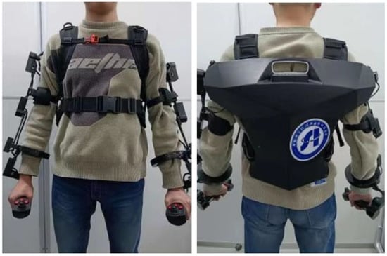 The back frame and the joint parts were mainly manufactured with high-strength aluminum alloy A7075P. The upper arm linkage, forearm linkage, and wrist linkage were made of 5 mm carbon fiber tubes, which are lightweight and high stiffness.