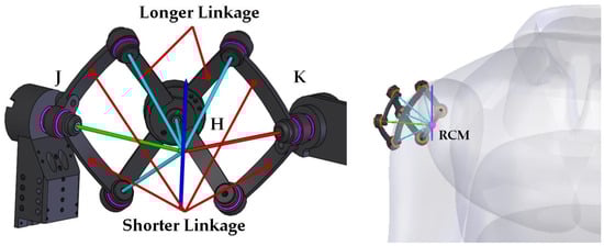 As dedepicted in Figure 3, the spherical scissor mechanism is composed of six curved linkages and seven common joints. The two longer curved linkages have twice the arc length of the shorter curved linkages. Three 17-bit absolute encoders (Netzer, DS-25, Misgav, Israel) are installed on joints J, K, and H to measure the rotational angles. The axes of all the joints pass through the same point at the sphere center, which is referred as the remote center of motion, or RCM. To make the spherical scissor mechanism properly compatible with the shoulder motions, the RCM of the joints should be configured near the rotational center of the GH joint of the human body as much as is possible. Every curved linkage of the mechanism is an arc between the joints at its two ends on the great circle. All the curved linkages have the same radius. The above conditions guarantee the spherical scissor assembly always moves on the surface of the sphere.