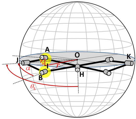 As depicted in Figure 4, the pitch angle is defined as the span of a single rhombus of the spherical scissor mechanism. When fully deployed (Figure 4), is limited by the collision of the bearings installed at joint A and joint B. The point I is defined as the intersection of the arc between AB and the equator of the sphere. When the bearings at joint A and joint B collide, the curvature angle from A to I is approximate to , where is the radius of the bearings and is the radius of the working sphere. The curvature angle of the shorter linkage is defined as . In the spherical triangle AIH, the relationship of , , and can be derived from the spherical cosine theorem as follows: