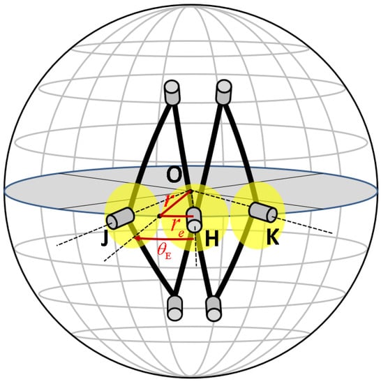 The radius of the encoders at J, K, and H is defined as . The curvature angle from the collision point to the axis of the encoder is approximate to . So, the total pitch angle of the spherical scissor mechanism under its maximum folded condition can be derived as follows: