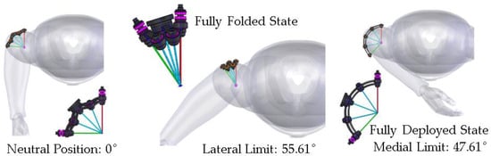 In the development of a prototype, the diameter of the bearings at joints A and B is 16 mm. The diameter of the encoders at joints J, K, and H is 30 mm after installation. If we desire the range of motion of the medial direction to be greater than 45°, the minimum curvature angle value can be determined as 34.36° according to Equation (1). So, we use 35° as the curvature angle of the shorter linkage for convenience. The total pitch angle of the maximum folded mechanism is 34.39°. So, as illustrated in Figure 6, the expected range of motion in lateral and medial directions will be 55.61° and 47.61° respectively in the designed prototype.