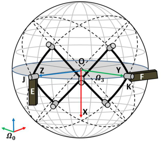Similarly, the spherical scissor mechanism will be limited by the collision of the encoders at J, K, and H to achieve the fully folded status, as illustrated in Figure 5.
