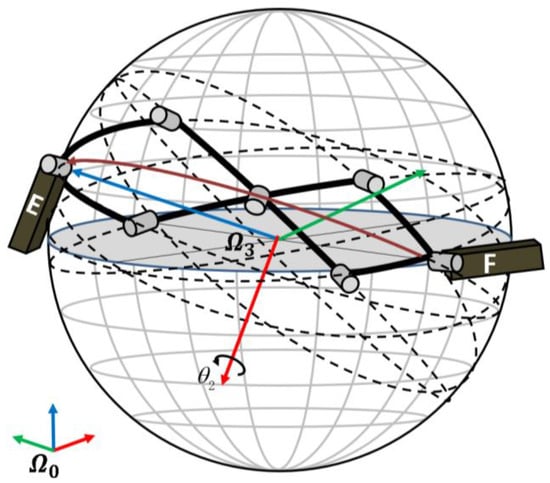 The 3-DOF spherical scissor mechanism is kinematically equivalent to the 3R shoulder part in Figure 2. So, the shoulder pose, which is described by the joint positions of the 3R mechanism (, , and ), can be estimated from the decomposition of the spherical motion of the exoskeleton shoulder. The spherical scissor assembly is connected with the upper arm linkage E by joint J and connected with the base frame F by joint K. Considering that all the curved linkages have identical curvature radius and RCM, only the orientation of the upper arm frame should be concerned with the moving of the shoulder, which is illustrated as the rotation of linkage E with respect to the base frame on linkage F in Figure 7. For convenience in describing, coordination systems are established as follows. For the base frame , the X axis is parallel with linkage F and the positive direction is pointing to the center of the back wearer. The Z axis is perpendicular to X and points upward. For the frame fixed with linkage E, the Z axis is parallel to the rotational axis of joint J and the positive direction is pointing outward from the sphere. The X axis is parallel to the upper arm linkage E and the positive direction is pointing to the elbow joint.